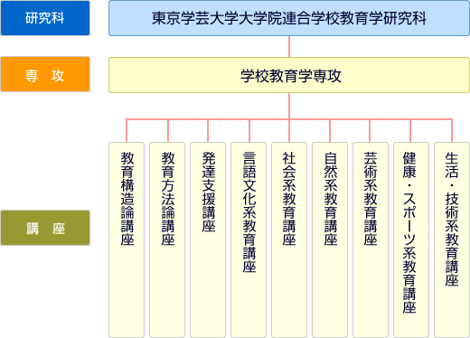 本研究科は,学校教育学専攻の1専攻で組織し,教育構造論講座,教育方法論講座,発達支援講座の教育科学関係の3講座と,小中高校の各教科の内容を研究する基礎科学と教科教育学とを含んだ言語文化系教育講座,社会系教育講座,自然系教育講座,芸術系教育講座,健康・スポーツ系教育講座,生活・技術系教育講座の教科領域関係の6講座の合わせて9講座で構成しています。