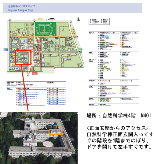 自然科学系研究棟 4階 M-401(正面玄関のらせん階段を上り、屋上からお入りください)