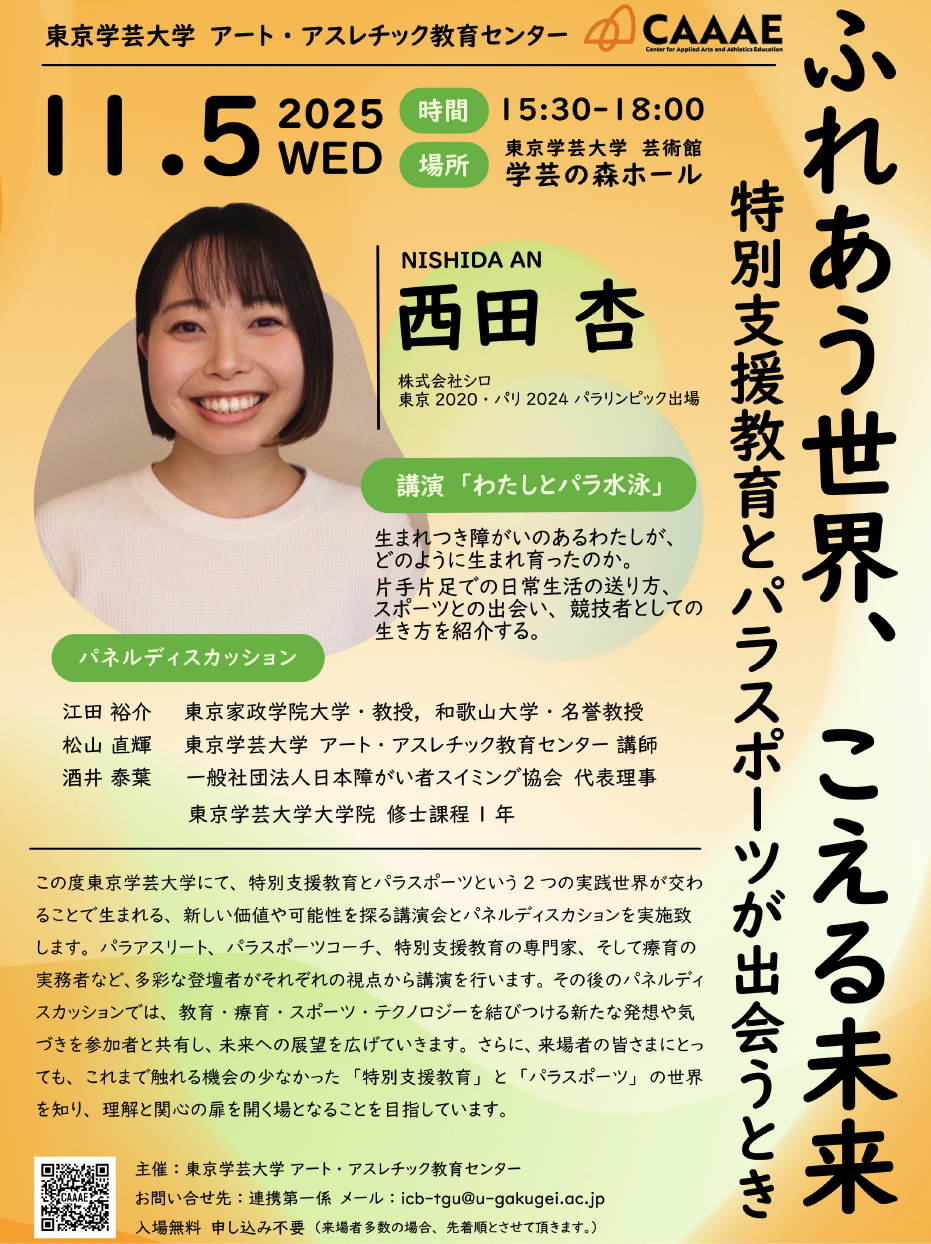 本公演は、本学卒業生でパラリンピアンの西田杏さんをお招きし、パラアスリート、パラスポーツコーチ、特別支援教育の専門家を招き、本センターでは特別支援教育とスポーツの新たな可能性をテーマとしたイベント「ふれあう世界、こえる未来」を開催いたします。