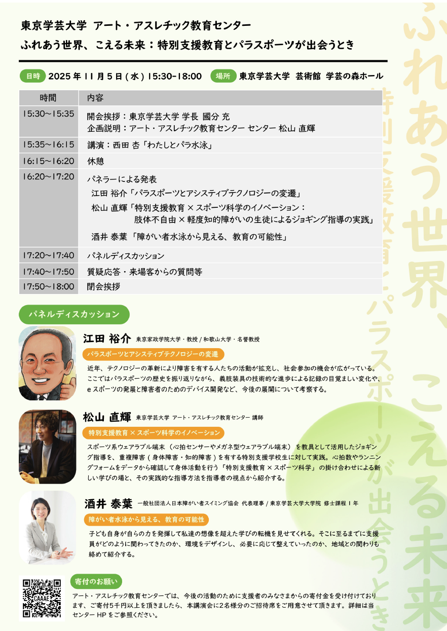 障がいの有無や立場の違いをこえて「ふれあう」ことから生まれる学びや成長に焦点を当て、現場での実践報告や対話を通して、インクルーシブな教育・スポーツの未来を考えます。