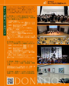 アート・アスレチック教育センターでは、5千円以上のご寄附を頂いたみなさまへ感謝の気持ちとして、本学における演奏会へのご招待、または「美術+書道展」の図録や、下敷きをご用意させて頂くことに致しました。数に限りがありますので、いずれも先着順で締め切らせて頂きます。