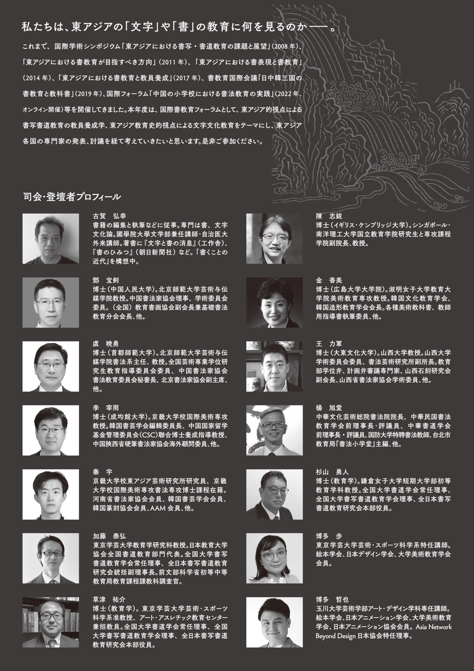 陳志鋭(シンガポール・南洋理工大学教授)、鄧宝剣(北京師範大学教授)、虞暁勇(北京師範大学教授)、金香美(淑明女子大学教育大学院教授)、李宰雨(京畿大学校国際美術専攻教授)、秦 宇(京畿大学校東アジア芸術研究所研究員)、王力軍(山西大学教授)、楊旭堂(中華民国書法教育学会前理事長・評議員)、博多歩(東京学芸大学特任講師)、博多哲也(玉川大学芸術学部アート・デザイン学科講師)、杉山勇人(鎌倉女子大学短期大学部教授)加藤泰弘(東京学芸大学教職大学院教授)、草津祐介(東京学芸大学芸術・スポーツ科学系准教授)
