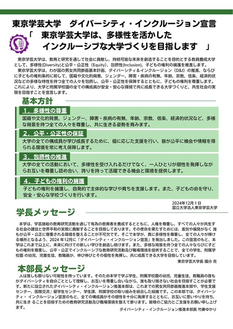 東京学芸大学は、教育と研究を通して社会に貢献し、持続可能な未来を創造することを目的とする教員養成大学として、多様性(Diversity)と公平・公正性(Equity)、包摂性(Inclusion)、子どもの権利の擁護を推進します。東京学芸大学は、わが国の男女共同参画基本計画、ダイバーシティ&インクルージョン(D&I)の推進、ならびに子どもの権利条約に即して、国籍や文化的背景、ジェンダー、障害・疾病の有無、年齢、宗教、信条、経済的状況などの多様な特性を持つ全ての人々を包摂し、公平・公正性を保障するとともに、子どもの権利を尊重します。これにより、大学と附属学校園の全ての構成員が安全・安心な環境で共に成長できる大学づくりと、共生社会の実現を目指すことを宣言します。