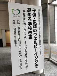 2026年3月14日(土)、文部科学省講堂にて開催された国立教育政策研究所主催の教育改革国際シンポジウム「子供・教師のウェルビーイングを高める学校改革 ― 教育政策における『ウェルビーイング』の捉え方と取組 ―」に参加しました。