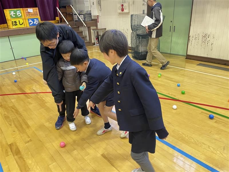 附属幼稚園と交流したのは、3年2組と3組です。3年生が幼稚園生と一緒に名札を作ったり、学校探検を通して小学校を紹介したりしました。多くの時間をペアの子と過ごし、仲良くなりました。最後には、お互い別れを惜しむ姿が見られ、「もっと遊びたい!」という声があがりました。