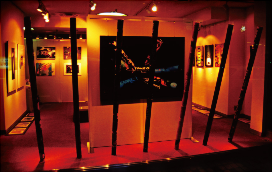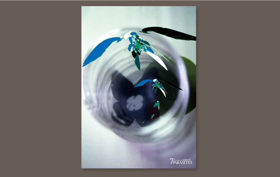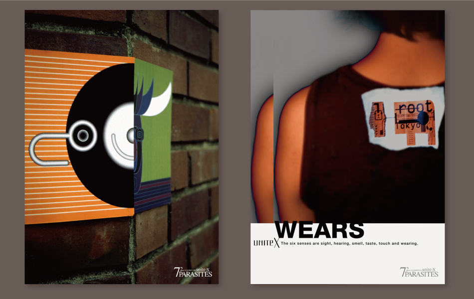 「7Parasites」展のテーマは、「パラサイト=寄生」。とるに足らないビジュアルの断片が、現実の世界に息づき、増殖していく。そんなイメージを表現したグラフィック・アート作品を発表した。無数のビジュアルソースを紙に印刷し、それらを壁に貼り、地面に置き、体に身につけて、寄生させる。この状況をカメラで撮影し、コンピュータに取り込んで加工する。こうしたアナログとデジタルの振幅運動によって、グラフィック・アートのカオスが生まれた。コンピュータによって創りだされる造形は、どことなく平面的で無機質だ。しかし、「パラサイト」したソースは、心地よいアナログのノイズと相まって、文字通り「グラフィックな=生き生きとした」ビジュアルに転じたのだ。デジタルカメラといった便利な道具はなかったので、かなりの本数のフィルムを費やしたことになる。完成した作品を今あらためて眺めると、実に感慨深い。それにしても手間のかかる作業を飽きずにやっていたものだ。