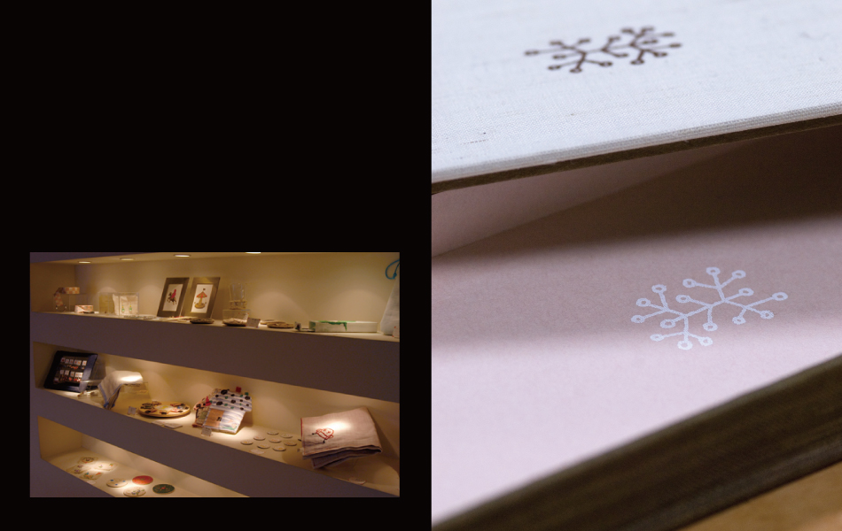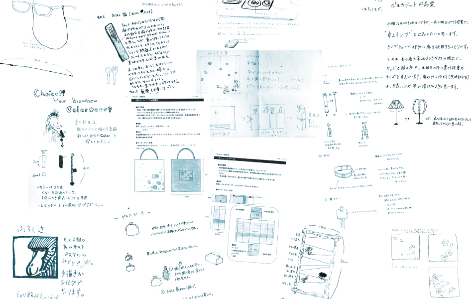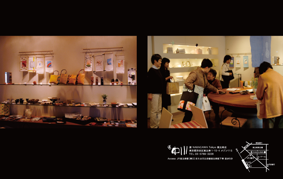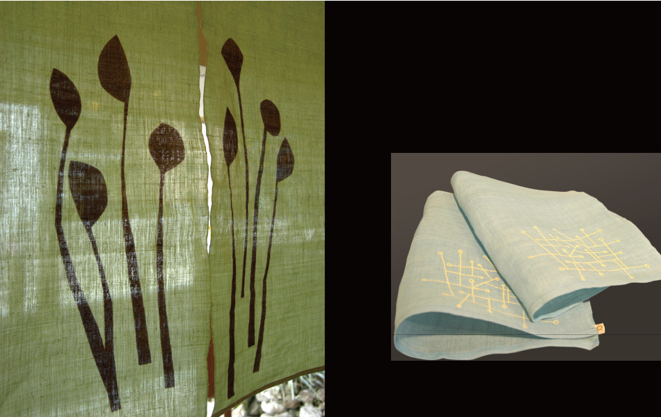 前回の企画展をご覧いただいた企業の方から「今度、お店で企画展示をしてみませんか?」とのお誘いを受けた。これが契機となり、麻の販売業者「遊・中川」さんとのコラボレーションが実現した。「春の新生活を彩る麻を活かした雑貨作り」をテーマに、学芸大の学生を中心に他大学の学生、さらに社会人も加わり、総勢40名が集まった。参加者のほとんどが「麻」素材を扱うのは初めて。そこで「遊・中川」さんのご好意で、事前のレクチャー会も開催された。私は、文庫、のれん、ミニ掛け軸、ブックカバー等を制作。なれない素材に苦戦しながらも、「麻」の風合いを活かした作品が完成した。一般のお客さんを相手に「売れるモノ」を作る難しさを実体験することができた。