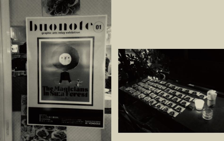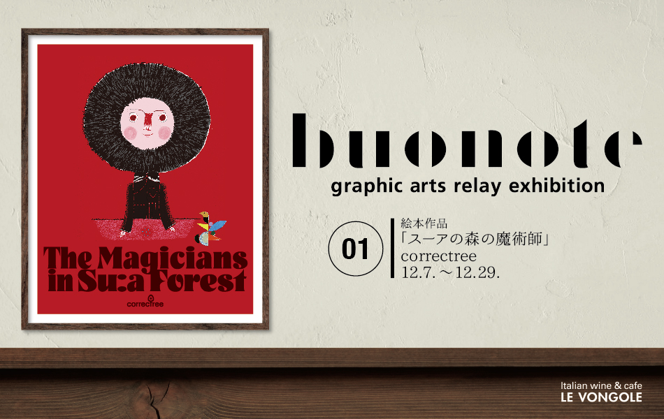 原宿にある「LE VONGOLE」でミニギャラリーの企画がスタート。その名は「buonote(ボーノート)」。「Buono(素晴らしい)」+「Note(気づき)」の造語。さまざまなグラフィックアートがリレー形式で登場し、何かを綴り、何かを物語る。小さな小さなギャラリーの誕生。その第一弾として、絵本「スーアの森の魔術師」の原画を展示。