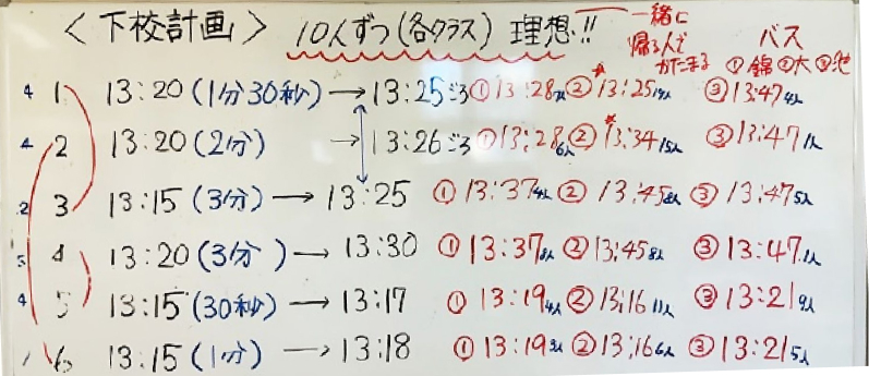 コロナ禍における分散下校について、下駄箱付近で起こる「密」と学年によって待ち時間の長短があることを解消する分散下校の案を考える。