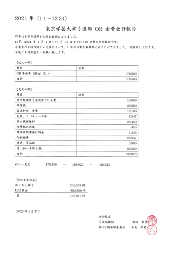 卒部生の皆様へ 第61回設立射会及び創部 60 周年記念祝賀会のお知らせ New! 第53回全巻等学生弓道選手権大会OB対抗戦出場のお知らせ 第53回全巻等学生弓道選手権大会OB対抗戦出場について 60周年記念事業のお知らせ 第60回 東京学芸大学弓道部 設立射会のお知らせ 全日本学生弓道連盟70周年記念式典について 第52回全関東学生弓道選手権大会OB対抗戦出場と結果について 2021年度会計報告 矢筒について