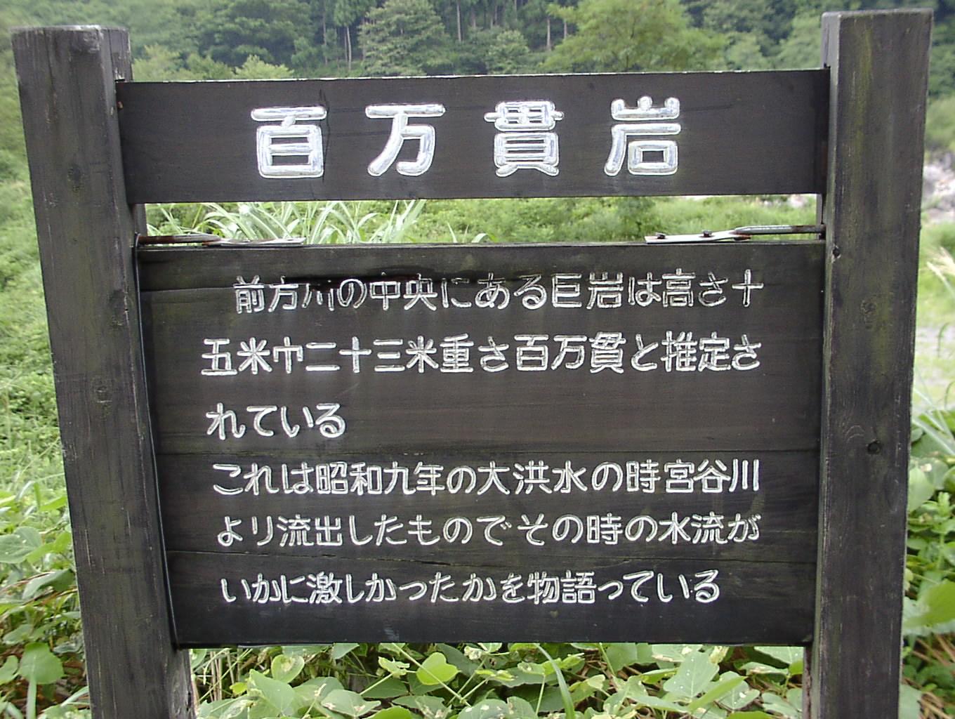 看板の内容 前方の中央にある巨岩は高さ一五米巾二十三米重さ百万貫と推定されている. これは昭和九年の大洪水の時宮谷川より流出したものでその時の水流がいかに激しかったかを物語っている.