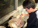 この宿舎は完全自炊のため,何かつくななければならない.台所は,とてもこの世のものとは思えない食材が発掘されたり,洗ったのかわからないお皿が出ていたり・・・.これはとても料理をする環境ではなかった.ゆえに鍋にすることに・・・.ジャスコで食材を買い込んで(先生はカニ・イカを主張.反対できるわけもなく・・・)その他,私はいつものソーセージを主張・・・.却下されそうになったが,何とか押し通した.今回は,ロールキャベツを言い出せる状況ではなかった・・・.うどん9玉も買った(人数は6人である).