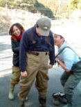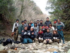 調査は,胴長をはいて川の中へ・・・寒かった.しかも,柴田さんと白井と組んで沢に入って行ったのであるが,そこがコケだらけ・・・.コロンコロンすっ転んだSはあーとかうーとか言いながらコロンコロン・・・.院生Sさんは転んで胴長が壊れていしまった(XX)わたくしもつるを使って下るときにそのつるが切れて転んだりたいへんだった.