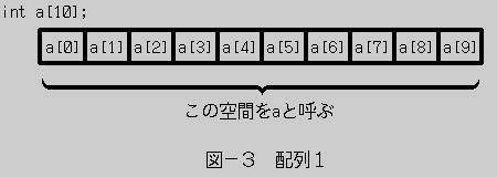 先ほど,”配列という,親戚を集めて同じ名字を名乗らせる方法”と述べたが,つまりこれはポインタにしろ,配列にしろ,(ある時点では)あるデータエリアのアドレスが(値として)格納されている,ということによる.その変数名からは,格納している具体的なアドレスは分からないが,必ずそのエリア内にあるアドレスを格納している(つまり本当の物理的アドレスは分からないが,どこかの領域を表している).という事は逆に,その領域全体を総して,その変数名で呼んでも構わない.(図−3参)