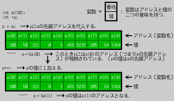 この考え方は,少々混乱を招くかも知れない.すでに述べたように,配列名にはその先頭アドレスが格納されており,添え字はその数字分だけ後ろのアドレスを指す.この考え方に従えば,aにはa[0]のアドレスが格納されていることになる.領域全体と,変数一つでは大きく異なるように見える.しかし,両者は同じ事を言っているのである.