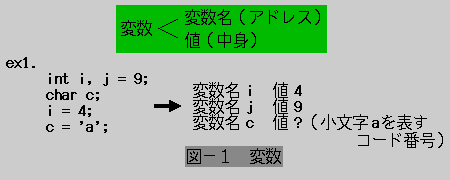 ここで変数名と言うものが出てきたが,これはchar a,int bなどのa,b のことである.我々が通常”変数”と呼んで扱っているのはこの変数名である.これまでの説明で,変数名は格納するアドレスを意味していることお分かりいただけるだろう.変数にはもう一つの側面があり,それは格納されている値である(3.2節参照).この概念は,この後の解説で非常に大切なので,覚えておいていただきたい.(図−1参)