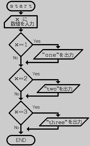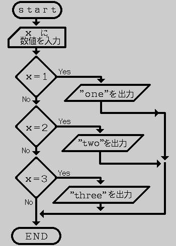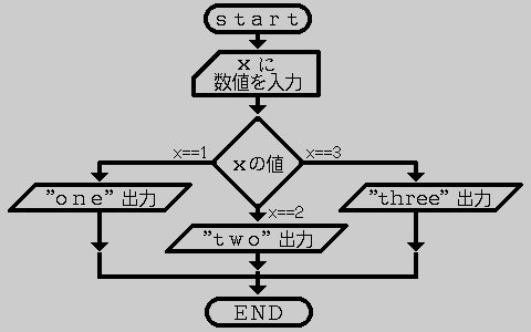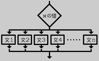 | £¹¡Á£±£´¡§ | £ó£÷£é£ô£ã£è¡Ý£ã£á£ó£åʸ¤Ç¤¢¤ë¡££ø¤ÎÃͤˤè¤Ã¤Æ¼Â¹Ôʸ¤¬ÊѤï¤ë¡£¤³¤Î¾ì¹ç¡¢£ø¡á£±¤Î¤È¤£±£°¡§¤ò¡¢£ø¡á£²¤Î¤È¤£±£±¡§¤ò¡¢£ø¡á£³¤Î¤È¤£±£²¡§¤ò¼Â¹Ô¤¹¤ë¡£¤½¤ì¤¾¤ì printf ¤Ç±Ññ¸ì¤ò½ÐÎϤ·¤¿¤Î¤Á break ʸ¤Ë¤è¤Ã¤Æ£ó£÷£é£ô£ã£è¡Ý£ã£á£ã£åʸ¤ò¤Ì¤±¤ë¡£¤Ä¤Þ¤ê£±£´¡§¤ØÀ©¸æ¤¬°Ü¤ë¡Ê¼Â¹Ô¤¬¤È¤Ö¡Ë¡£ ¤â¤·¡¢£±£°¡§¤Ç break ʸ¤ò¤Ê¤¯¤¹¤È¡¢£ø¡á£±¤Î¤È¤¤Ë¤Ï One ¤È Two ¤¬½ÐÎϤµ¤ì¤ë¡£¤³¤ì¤Ï break ʸ¤¬¤Ê¤¤¤¿¤á¤ËÀ©¸æ¤¬¼¡¤Îʸ¡Ê£±£±¡§¡Ë¤Ë°Ü¤Ã¤¿¤¿¤á¡¢ Two ¤â½ÐÎϤµ¤ì¤ë¤³¤È¤Ë¤Ê¤ë¡£ |