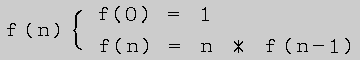 上の例で5!を求めるのに5と4!を掛け合わせていますが、これは4!がその値を持っているということですね。えっ、何を当たり前のことをいっているのかって? それとも良くわかりません?? では先の関数f(n)=n!を用いて説明しましょう。