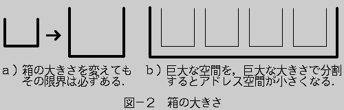 逆に,予測し得る大きさの箱を用意しておくことは,メモリの無駄になる.なぜなら,1wordに大きな空間を与えると,使えるアドレスの数が減少する.(広大な土地を大きく切り分けて分譲すると,分譲地を購入できる人数は減ってしまう) さらに,この様な巨大な空間がごろごろあっても,その中身を一杯にすることは滅多にない.(図−2参)