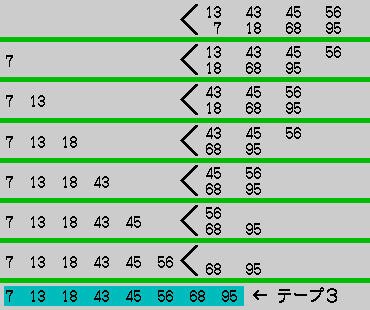13 43 45 56 ← テープ1 7 18 68 95 ← テープ2これらを、マージしよう。