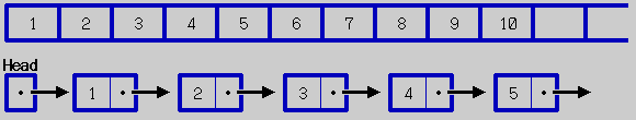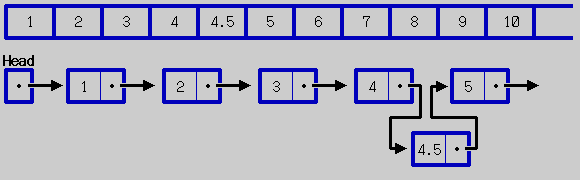 配列の場合、添字の概念とそれにより指定された記憶領域が存在するため、5番目のデータを指定すれば5が即座に得られる。これに対してリストは添字の概念が全くないため、Head から順に5回ポインタを渡って5番目のデータを得ることができる。4と5の間にデータ4.5を挿入することを考えてみよう。配列の場合、10から5までを順に右へ移動し,5が格納されていた場所に4.5を格納することになる。このように、記憶領域そのものを変更することになる。リストの場合、新たに別の記憶領域を確保しそこに4.5を格納し、つぎのデータを指すポインタを5の記憶領域を指すようにする。そして、4の次を指すポインタを4.5の格納領域を指すように変更する。