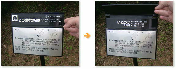学芸大学のグリーンアドベンチャーコースでは、50本の木の前にQAパネルが設置されています。QAパネルにはそのままの状態では植物名は表示されませんが、その植物のヒント、用途などを知ることができます。上部をめくることにより植物名や科名を知ることができます。