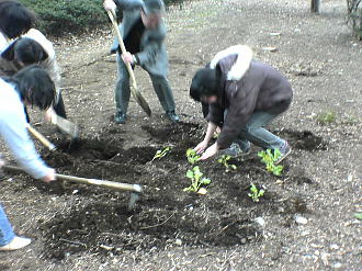3月14日、掛川市在住の相沢さんから寄贈された「なのはな(=アブラナ)」の苗120本を生協南側/万葉池北側に植えました。植栽には鷲山学長、学芸の森プロジェクトメンバー、そして通りがかりの同窓生も加わって和やかに行われました。