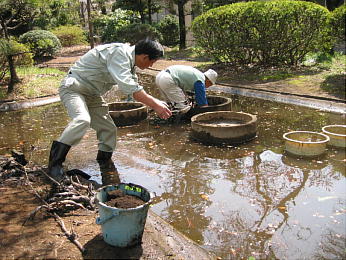 3月30日および4月4日に、小金井市在住の岸野さんから譲り受けたシダレウメおよび大賀ハスを、それぞれ講義棟南東の角地および万葉池に植栽しました。シダレウメは花が桃色の見事なもので、来年の3月初旬が楽しみです。また、大賀ハスは古代ハスとも呼ばれるハスで、2000年前に生じた種から発芽したハスの子孫です。