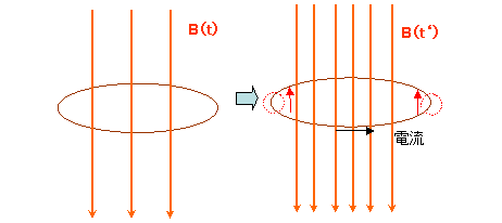 簡単のため,上図のような垂直な磁場に貫かれる円形導線を流れる電流を考えてみる.実験によると,何らかの理由で円を貫く磁束密度が変化すると,「その変化を妨げる向きに磁場を発生させるような」電流が流れる.(ややこしい表現だが,磁場が電流を作るならば,その電流はBiot-Savartの法則にしたがってさらに磁場をつくると考えられるが,その向きは磁場の変化と逆向きということである.図の点線で描かれた円を参照のこと.なお,ここで発生する電流は一定の電流ではなく,時間的に変化するから,厳密にはBiot-Savartの法則は成立しない.)