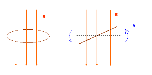 次に,磁束密度は一様だが,面に対して角度θの方向で加わっている場合を考える.この場合,面に垂直な成分だけが,電磁誘導に寄与するので