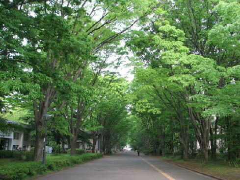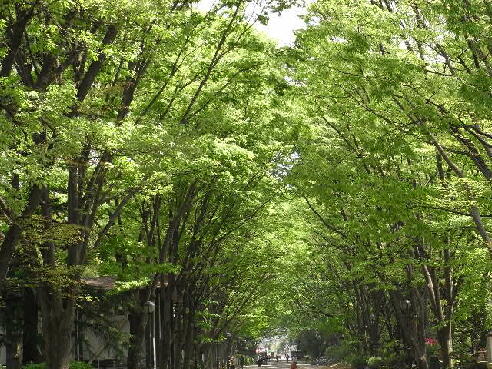 キャンパスは、図書館前の広場も、東門への道も、プール門への道も、ケヤキの新緑に映えています。