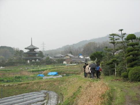 | 都小国研作文部と大熊研究室合同の恒例の春の研修旅行。大和小泉から法起寺をめざす途中で撮影。 |