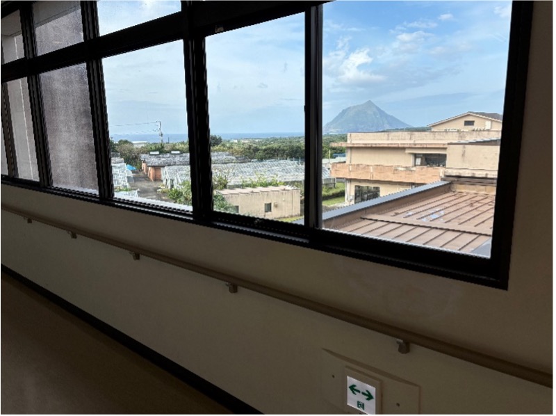 (写真左 廊下からは海と八丈小島)       (写真右 八丈富士が見守っている)