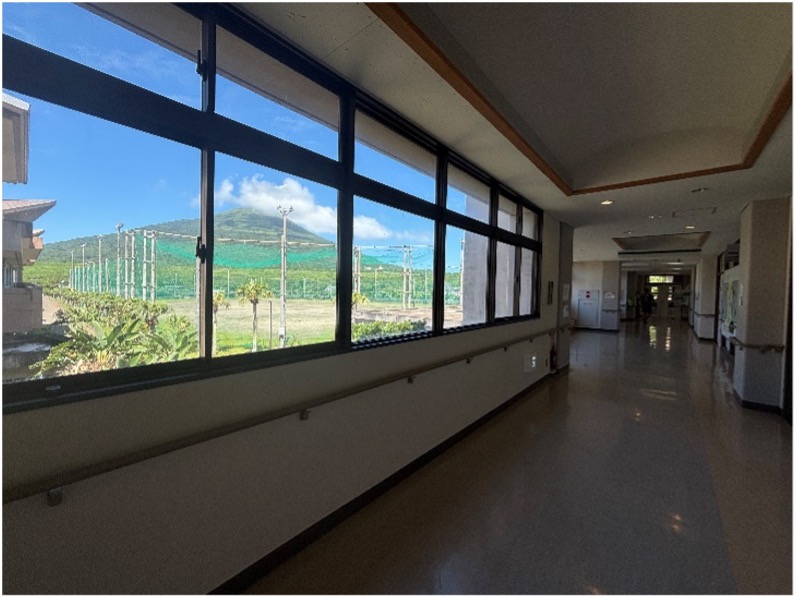 緑に囲まれ、廊下からは海が見える学校です。生徒たちは八丈小島や八丈富士に見守られながら、学校生活を過ごしています。