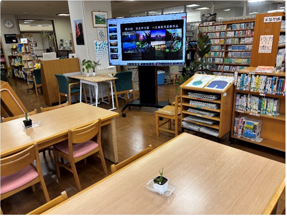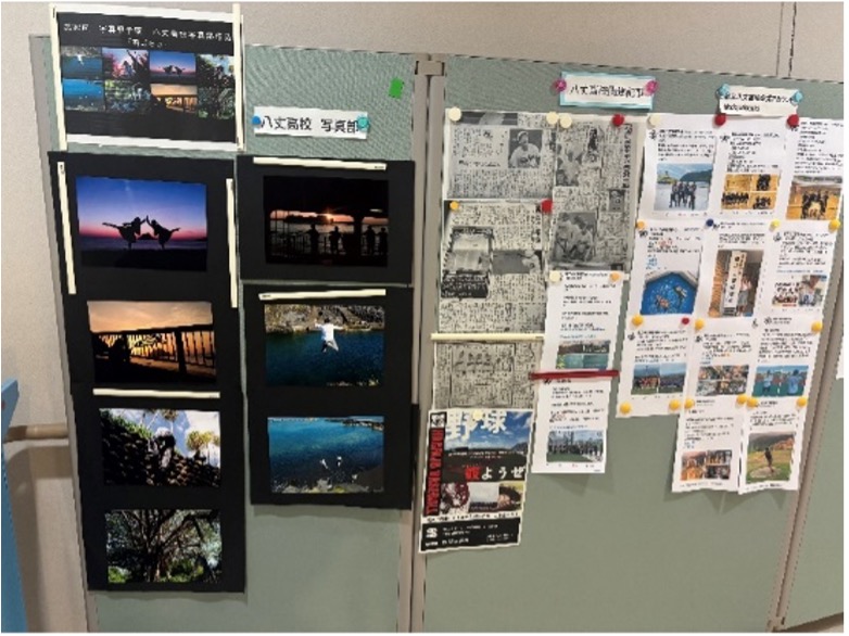 部活動の活動記録や成果を展示しています。一例として、八丈高校には「写真甲子園」全国大会に4年連続出場している写真部があります。八丈島の美しい景色や全国大会の舞台である北海道で撮影した美しい写真を図書館に展示しモニターでスライドショーにしています。