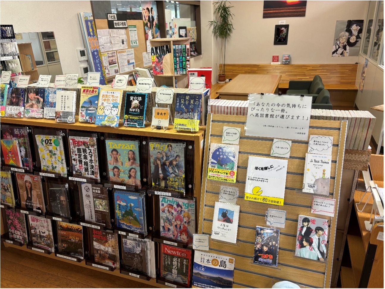 八丈島には雑誌や本を売っている店が数か所のみで日常的に雑誌を見かける習慣が無い生徒もいます。例えば、都会では立ち寄ったコンビニや商業施設に並ぶ雑誌の表紙で流行や最新情報に触れ、新しいことを知る機会が自然とありますが、島ではそのような施設も無いため、高校内で最新情報に触れられる場所としての役割もあります。