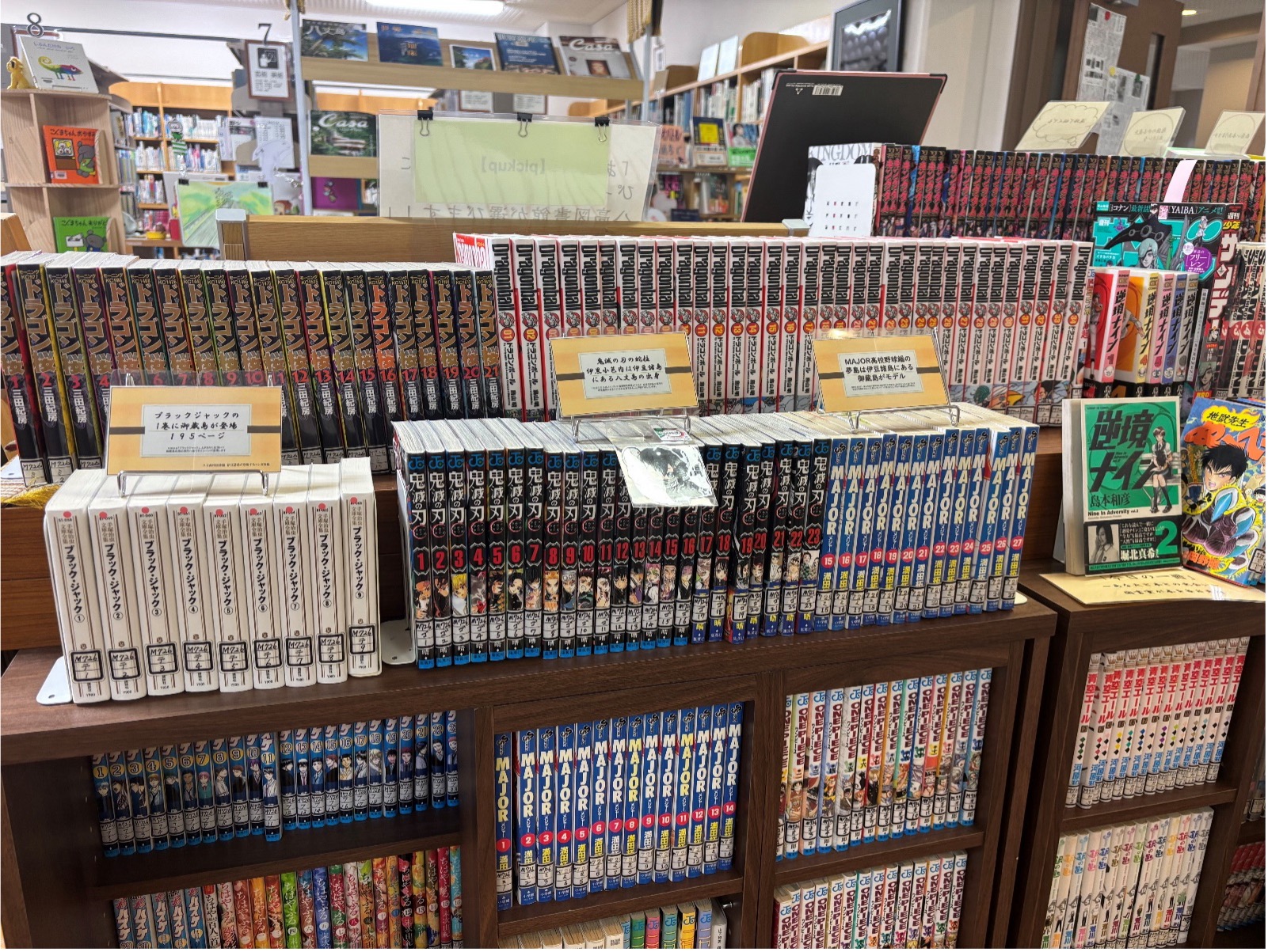 (島が出てくる情報を書いたPOPを付けた漫画コーナー)