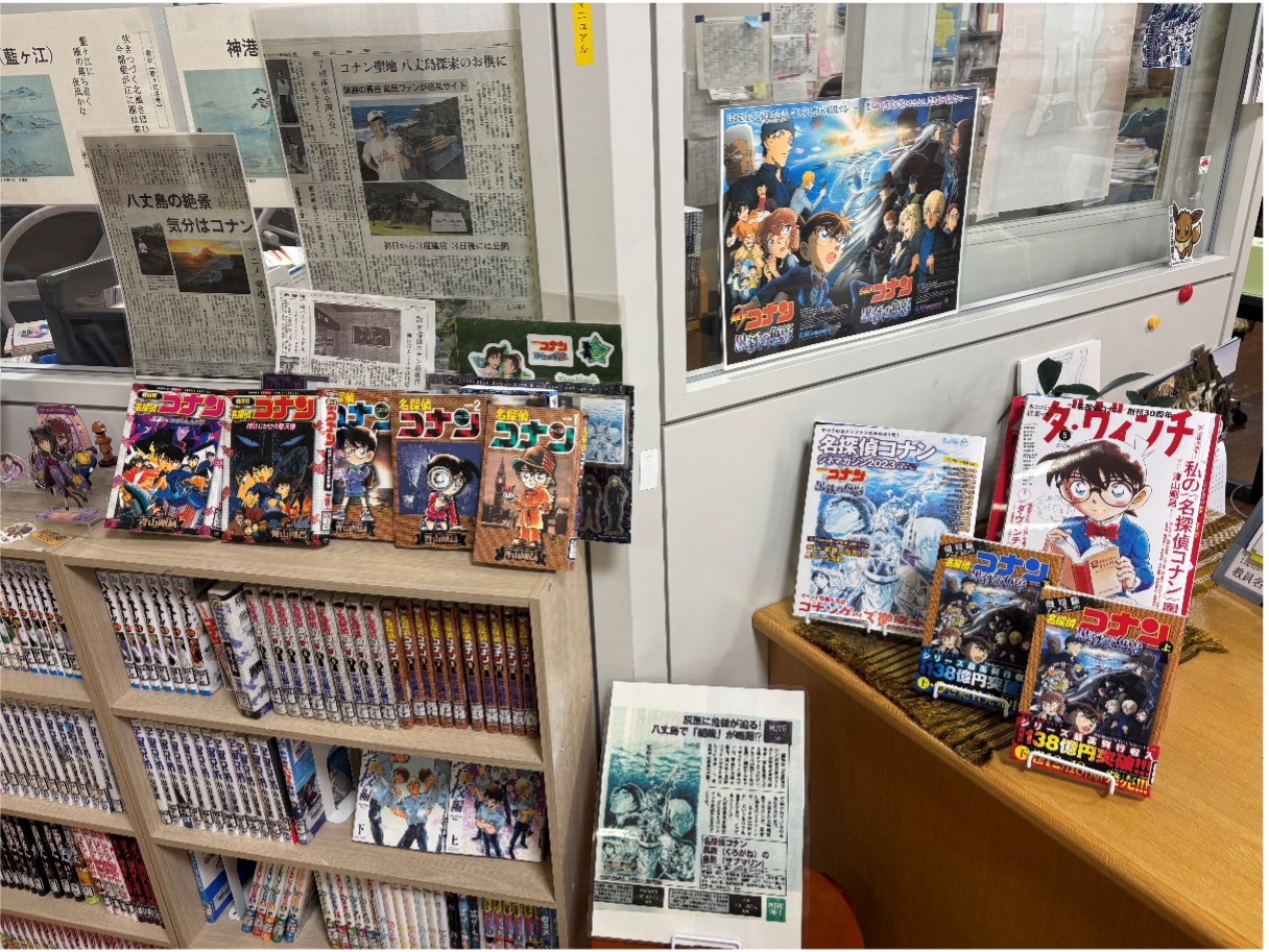 八丈島が舞台となった映画「劇場版名探偵コナン黒鉄の魚影」が島内でも大きな話題となり、関連書籍や新聞記事を集めた名探偵コナンの特設コーナーを設置しました。他にも作品に八丈島や伊豆諸島の島々が出てくることがきっかけで漫画を読み始めることができるような工夫をしています。