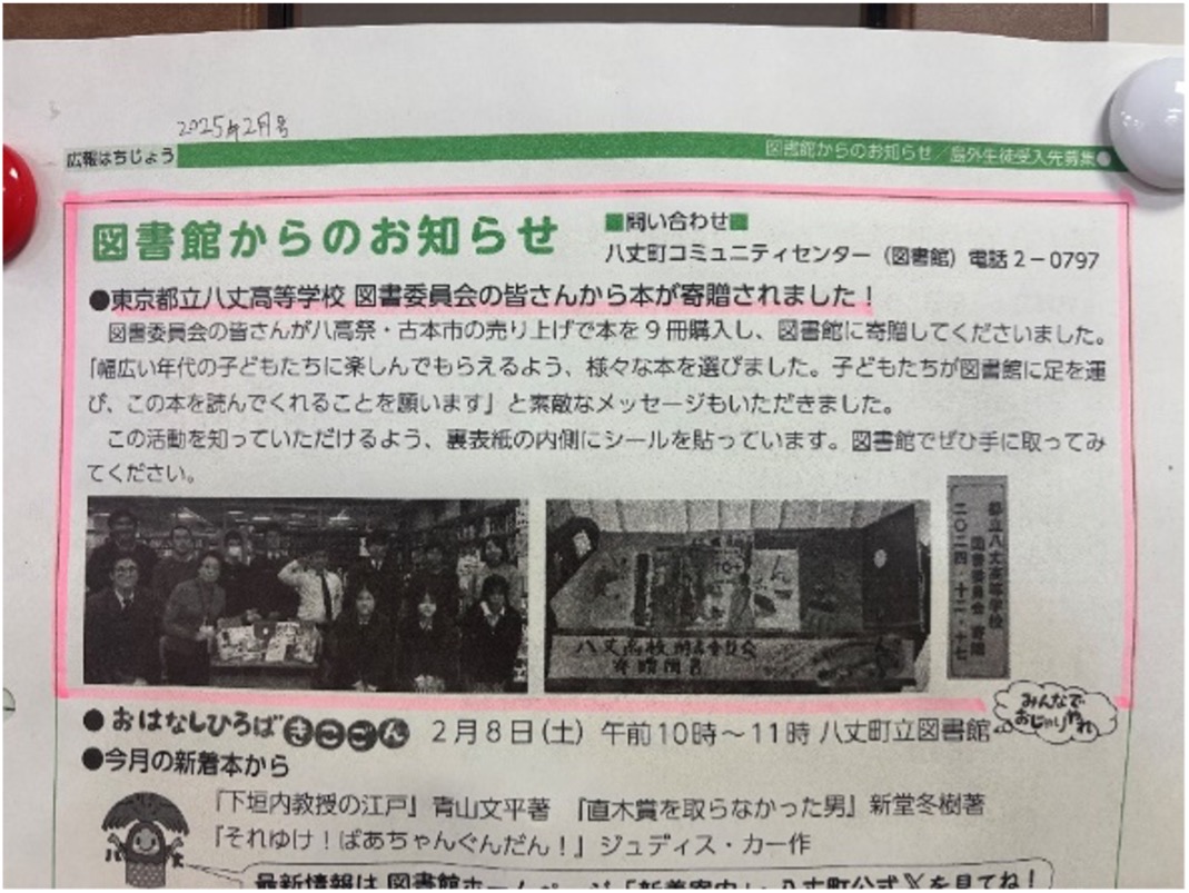 古本市の売り上げの寄付先を図書委員会で話し合って決めています。売り上げで本を買って、町の図書館へ寄贈する取り組みを2年連続で行っています。町の図書館の司書の方から欲しい本リストを頂いて、高校生で寄付する本を選び贈呈しています。町の図書館では高校生から寄付された本コーナーとして人気の本になっています。島全体へ貢献することを目指して八丈高校図書委員は活動しています。