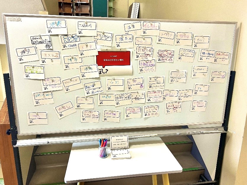 ホワイトボードには、毎月「お題」を貼っており、生徒のコメントを募集しています。
