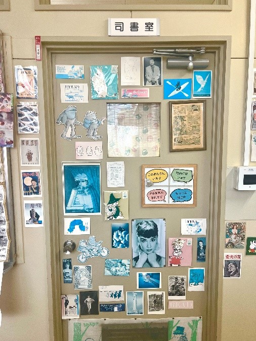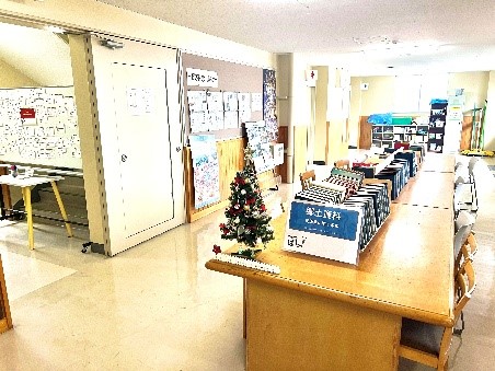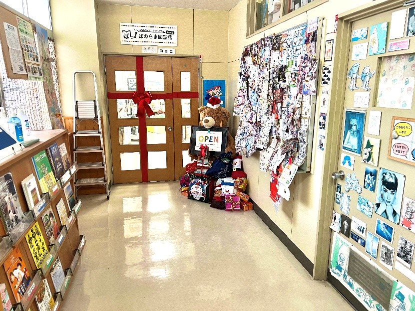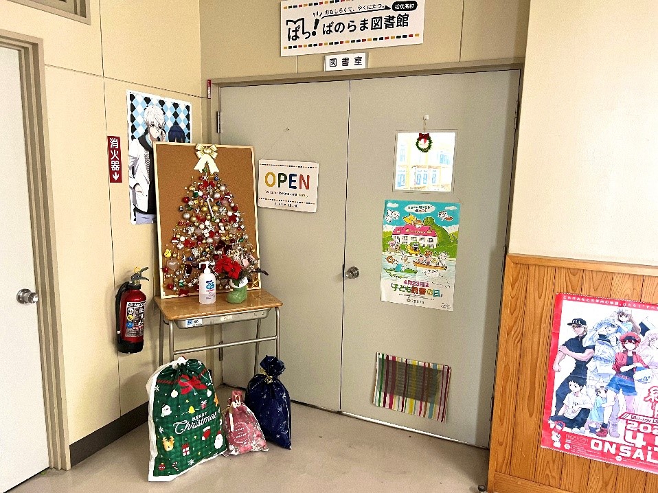 さらに右に行くと、図書館の入口です(右のドアは司書室)。今はクリスマスの装飾がしてありますね。