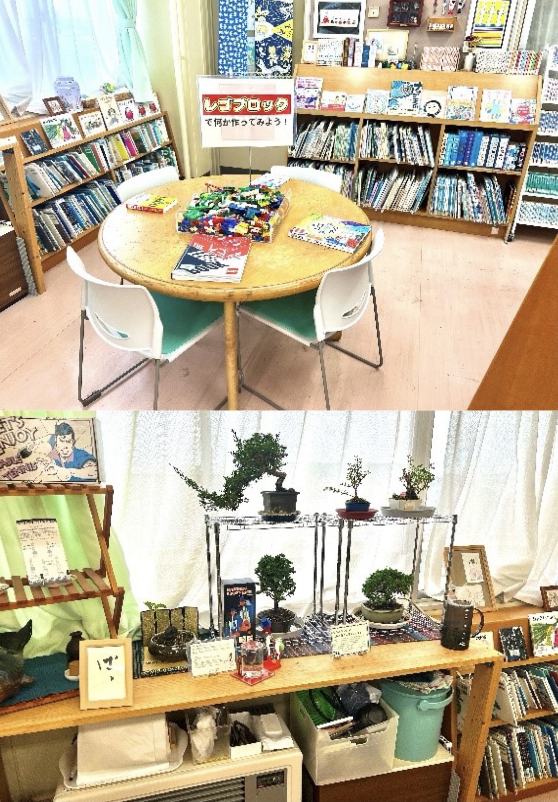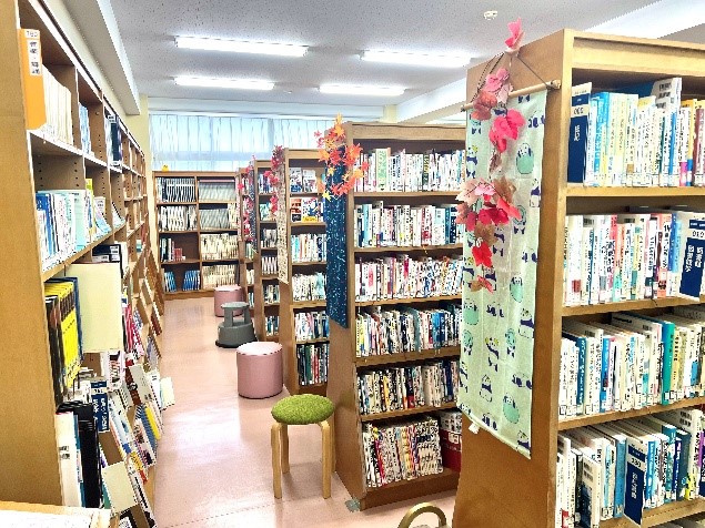 正面入口から右手を見るとこんな感じになっていて、文庫本用書架が立ち並び、その奥には「絵本コーナー」があります。生徒の描いたイラストが置いてあったり、レゴブロックが置いてあったり、盆栽が置いてあったりします。