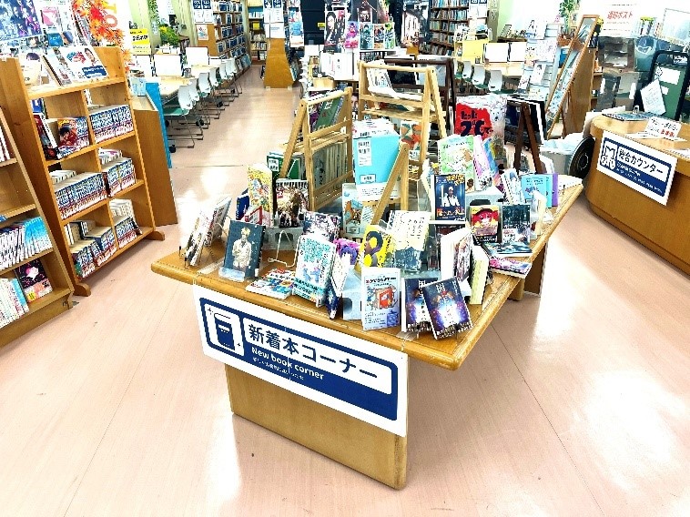 「新着本コーナー」の前の道は、館内のメインストリートです。裏口からも出入りできるので、図書館を通り抜ける人も多く、そういった人は必ずここを通ります。