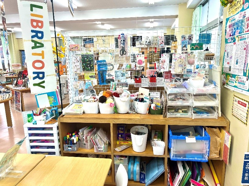 料理本が並ぶ「料理コーナー」のあたりから、「つくる」をテーマにした「LIBRATORY」が始まります。上の写真は各種文房具や工作用の道具と、折り紙、画用紙、毛糸など、手芸・工作に使える道具や材料をまとめた棚です。この棚に続いて手芸、工作、イラスト、創作や映像制作に関する本など、「つくる」に関わる本が並んでいます。