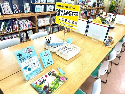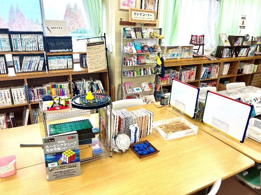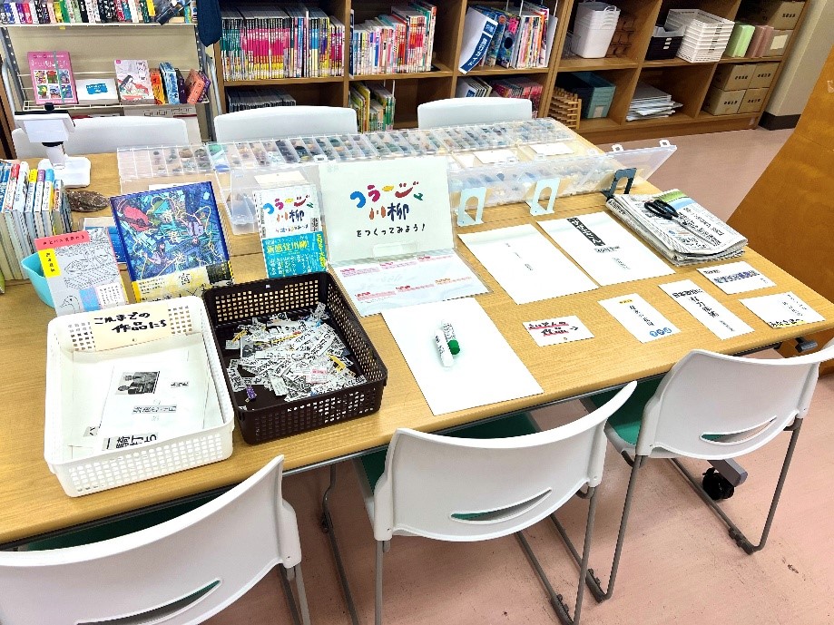 ボードゲームは館外貸出していませんが館内では自由に遊べます。また、『コラージュ川柳』や『学校図書館謎解きゲーム』など、イベント的な展示もこちら側の机の上に広げて置いておくことが多いです。
