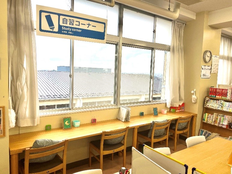 窓際にあるカウンターテーブルは自作したもので、窓に向かって座るので館内が多少にぎやかでもあまり気にならず、勉強や読書に集中できるかなと思って設置しました。