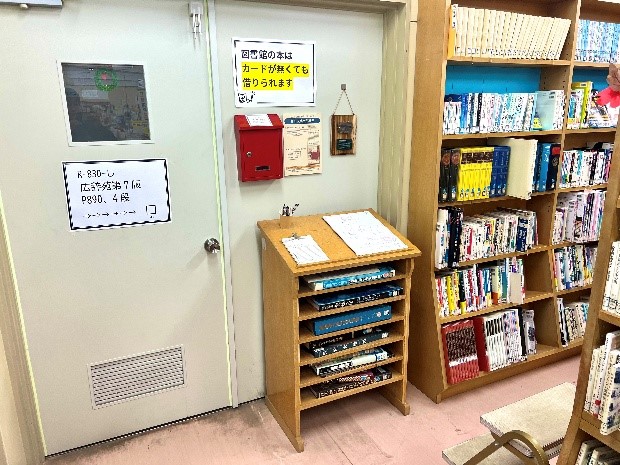 また、司書がいないときや、司書に貸出を頼みたくないとき、自分で貸出ができるようにセルフ貸出用ポストを用意しています。