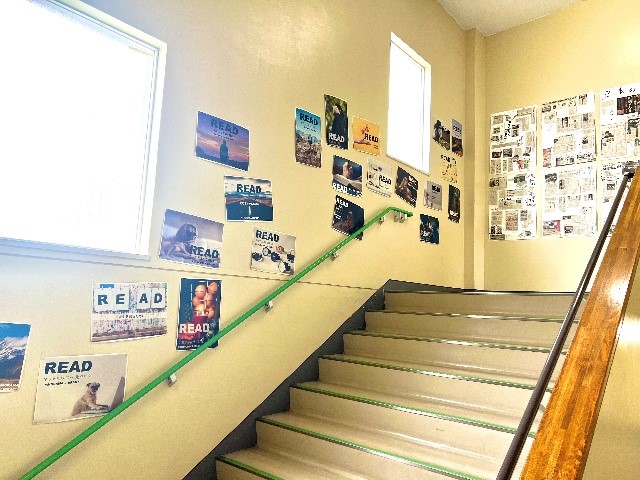 図書館は特別教室棟の5階にあります。普通教室棟は4階までしかないので、5階に上がる階段の踊り場には、案内看板やオープンサインを設置しています(左写真は東側階段の踊り場です)。