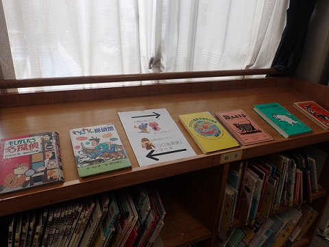 絵本書架の周りの子どもたちが手に取りやすい場所に、①はやみねかおる作品、②教科書掲載作品、③絵本や幼年向けの読みやすいもの、④古典、⑤色々な名探偵、と分類してコーナーを作成、表示は実習生が作成してきてくれました。9類の棚のあちこちに配架してあるミステリー作品が、一堂に会するとなかなかの迫力です。メインターゲットである4年生はもちろん、「図書の時間」の読み聞かせで来館する低学年にも大いにアピールするコーナーとなりました。図書委員の6年生が、お気に入りの「都会のトム&ソーヤ」シリーズが目立つところにあることに気づき「これっ、めっちゃ面白いから!」と興奮気味に友人に薦める姿も印象的でした。