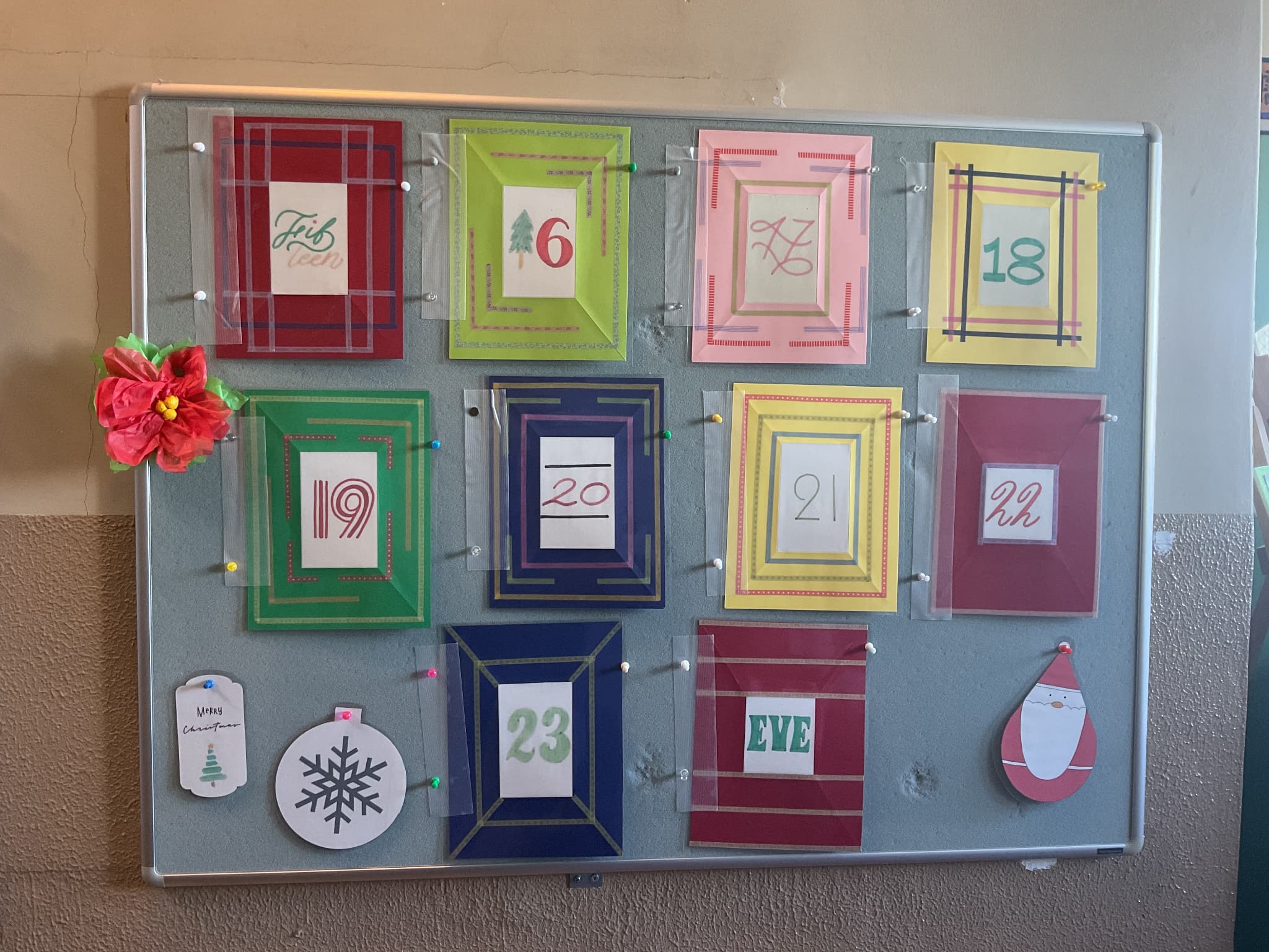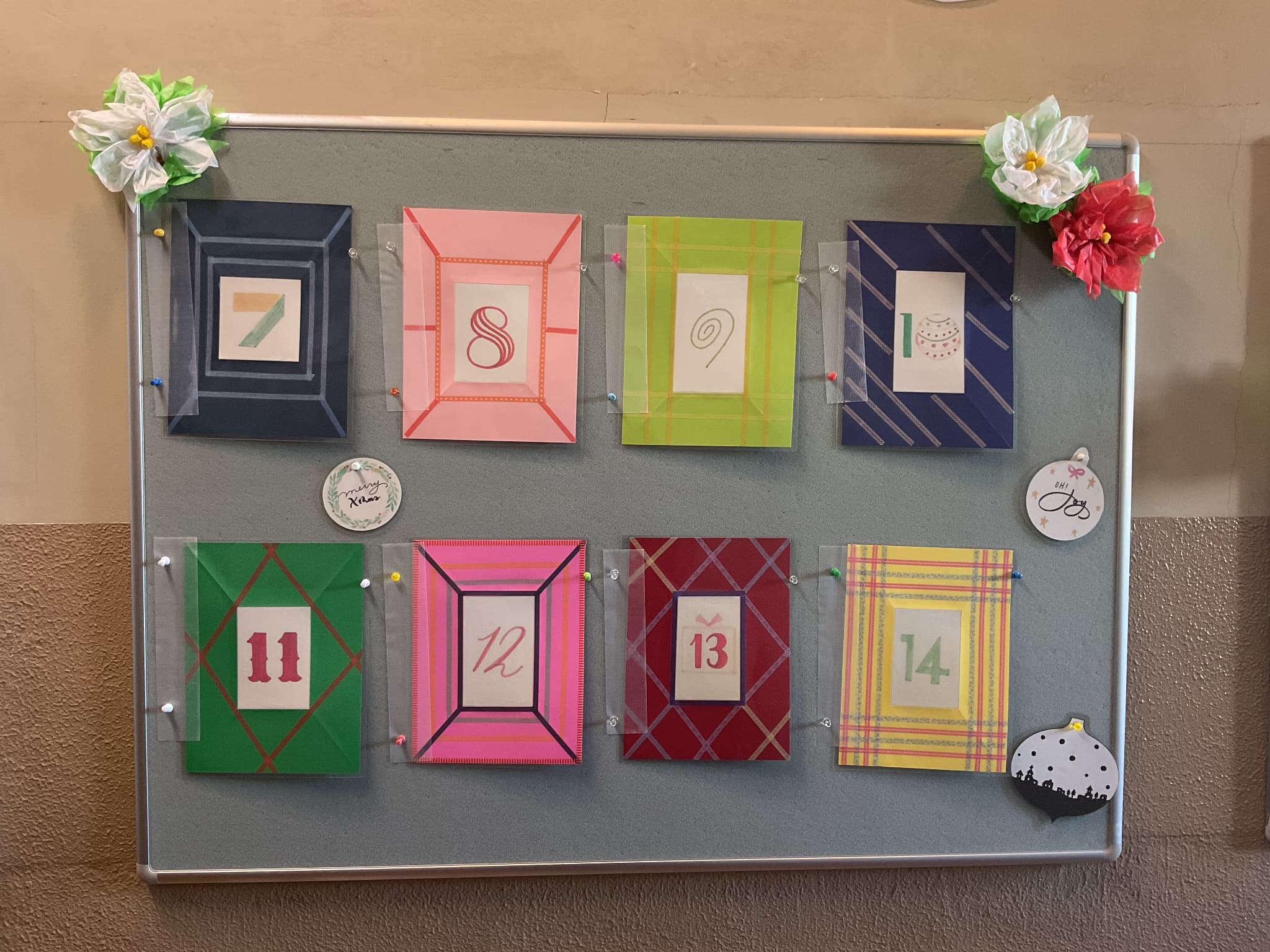 今年度は、メディアルーム入口の廊下掲示板にアドベントカレンダーを作ってみました。